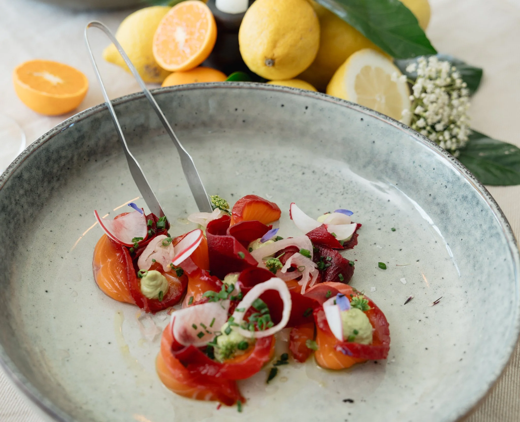 Beetroot and gin salmon gravlax with citrus and kawa kawa emulsion